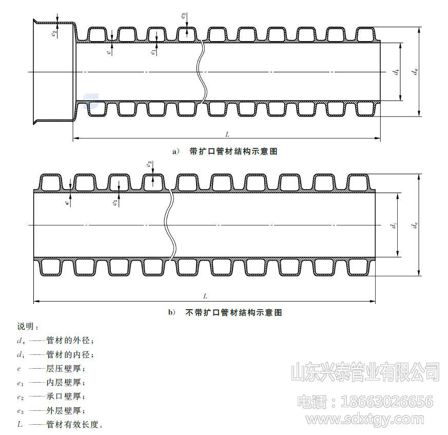 產(chǎn)品名稱:HDPE雙壁波紋管,聚乙烯雙壁波紋管 材料材質(zhì):PE/聚乙烯 執(zhí)行標(biāo)準(zhǔn):GB/T 19472.1 規(guī)格型號:DN/ID160-500mm(內(nèi)徑系列) 環(huán)剛度等級:SN4,SN8 外觀顏色:外觀內(nèi)壁均為黑色 產(chǎn)品長度:6米/支 連接方式:彈性密封圈 生產(chǎn)廠家:山東興泰管業(yè)有限公司 聯(lián)系電話:186 6302 6656 (高經(jīng)理) 適用溫度:長期使用溫度45℃以下的埋地排水、排污和通訊護(hù)套管用管材 產(chǎn)品介紹: HDPE雙壁波紋管,簡稱PE波紋管,80年代初在德國首先研制成功,是一種以聚乙烯PE為原材料,經(jīng)過擠出和特殊的成型工藝加工而成,內(nèi)壁光滑,外壁為封閉波紋型的一種新型輕質(zhì)管材,因采用了特殊的中空環(huán)形結(jié)構(gòu),具有優(yōu)異的環(huán)剛度和良好的強(qiáng)度與韌性。具有重量輕、耐高壓、韌性好、施工快、壽命長、摩擦系數(shù)小、連接方便可靠等特點(diǎn)。其優(yōu)異的管壁結(jié)構(gòu)設(shè)計(jì),與其它結(jié)構(gòu)的管材相比,成本大大降低。雙壁波紋管已成為管道領(lǐng)域“以塑代鋼”的首選管材,它克服了混凝土管,鑄鐵管等安裝難度大、易銹蝕、水流阻力大、滋生細(xì)菌、壽命短的缺點(diǎn)。 PE雙壁波紋管是為了在節(jié)省原材料而不致使管材的環(huán)剛度下降的前提下,對管材截面進(jìn)行優(yōu)化設(shè)計(jì)的一種內(nèi)壁光滑平整、外壁為梯形或弧形波紋狀、內(nèi)外壁波紋間為中空、采用擠出成型工藝制成的管材。因?yàn)槠渲饕牧蠟榫垡蚁≒E),故簡稱為PE雙壁波紋管。 PE雙壁波紋管內(nèi)徑系列管材尺寸(單位:mm) 公稱內(nèi)徑 DN/ID 最小平均內(nèi)徑 dim,min 最小層壓壁厚 emin 最小內(nèi)層壁厚 e1,min 最小外層壁厚 e3,min 最小結(jié)合長度 Amin 200 195 1.5 1.1 0.9 54 300 294 2.0 1.7 1.0 64 400 392 2.5 2.3 1.8 85 500 490 3.0 3.0 2.1 96 PE雙壁波紋管的優(yōu)點(diǎn) : 1、 產(chǎn)品結(jié)構(gòu)獨(dú)特,抗壓能力強(qiáng),具有足夠安全可靠的環(huán)剛度; 2、 節(jié)約原材料,用同樣的原材料做同一外徑的管材時(shí),波紋管比實(shí)壁管節(jié)省30%以上的原材料; 3、 重量輕,比重小于鑄鐵管和水泥管的50%; 4、 內(nèi)壁表面光滑,不易產(chǎn)生沉積,摩擦系數(shù)??; 5、 PE雙壁波紋管采用柔性密封圈連接,密封性能好,耐腐蝕,不結(jié)垢; 6、 具有良好的撓曲心梗,可適應(yīng)土壤的不均勻沉降; 7、 連接便捷、施工進(jìn)度快,與傳統(tǒng)水泥管相比,采用PE波紋管可以提高3倍以上安裝進(jìn)度,明顯降低施工費(fèi)用,縮短施工周期; 8、 生產(chǎn)成本低,埋地使用可達(dá)50年以上,綜合經(jīng)濟(jì)性能優(yōu)越。 PE雙壁波紋管的物理力學(xué)性能 項(xiàng)目 要求 環(huán)剛度/(kN/m2) SN4 SN8 ≥4 ≥8 沖擊性能(TIR)/ % ≤10 環(huán)柔性 管材無破裂,兩壁無脫開,內(nèi)壁無反向彎曲 烘箱試驗(yàn) 無分層,無開裂 密度/(kg/m3) ≤1180 氧化誘導(dǎo)時(shí)間(200℃)/min ≥20 蠕變比率 ≤4 PE雙壁波紋管的應(yīng)用領(lǐng)域 : 1、 市政工程,用于建筑物的地下排水管、排污管、輸水管、通風(fēng)管等; 2、 公寓、住宅小區(qū)、農(nóng)村地下埋設(shè)排水排污; 3、 電器電信工程,作為電力電纜、通訊光纜、通訊信號電纜的保護(hù)管; 4、 工業(yè),由于聚乙烯材料具有優(yōu)良的耐酸、堿及耐腐蝕能力,結(jié)構(gòu)壁管可用于化工、醫(yī)藥、環(huán)保等行業(yè)的給水和排水管道; 5、 農(nóng)業(yè)、園林工程,用于農(nóng)田、果園、茶園以及林帶排灌,可節(jié)水70%,節(jié)約用電13.9%,也可用于農(nóng)村灌溉; 6、 道路工程,可用作鐵路、高速公路、高爾夫球場、足球場等的滲、排水管; 7、 礦場,用作礦井的通風(fēng)、送風(fēng)管、排水管。 PE雙壁波紋管的連接: HDPE雙壁波紋管管道接頭應(yīng)采用彈性密封橡膠圈連接的承插式接口,橡膠圈接口應(yīng)遵守下列規(guī)定: 1、接口前,應(yīng)先檢查橡膠圈是否配套完好,確認(rèn)橡膠圈安放位置及插口的插入深度。 2、接口時(shí),先將承口的內(nèi)壁清理干凈,并在承口內(nèi)壁及插口橡膠圈上涂潤滑劑,然后將承插口端面的中心軸線對齊。 3、接口方法應(yīng)按下述程序進(jìn)行:DN400及其以下管道,先由一人用棉紗繩吊住被安裝管道的插口,另一人用長撬棒斜插入基礎(chǔ),并抵住該管端部中心位置的橫擋板,然后用力將該管緩緩插入待安裝HDPE雙壁波紋管管道的承口至預(yù)定位置;DN400以上管道可用兩臺手扳葫蘆將管節(jié)拉動就位。接口合攏時(shí),管節(jié)兩側(cè)的手扳葫蘆應(yīng)同步拉動,使橡膠密封圈正確就位,不扭曲、不脫落。 PE雙壁波紋管貯存方法: HDPE雙壁波紋管應(yīng)貯存于常溫干燥庫中,不宜暴曬。 HDPE雙壁波紋管應(yīng)平放,堆碼高度不得超過4m。 HDPE雙壁波紋管不允許與有毒有害物質(zhì)混放,應(yīng)遠(yuǎn)離熱源,在存放處應(yīng)設(shè)置醒目的禁火標(biāo)志。 存放期自生產(chǎn)之日起,一般不得超過2年。160 134 1.2 1.0 0.8 42